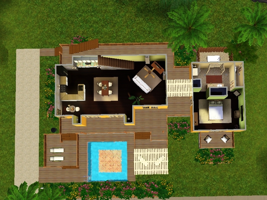 A Tropical villa, an inviting and warm home with open living/kitchen/dining areas and private master suite. One bath and two bedrooms on second level. Several decks and pool.