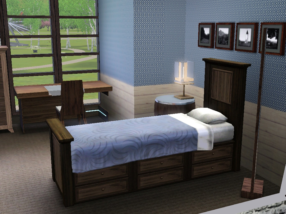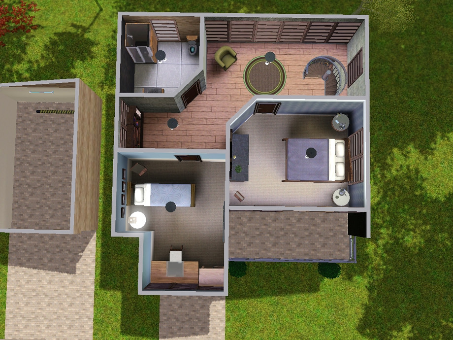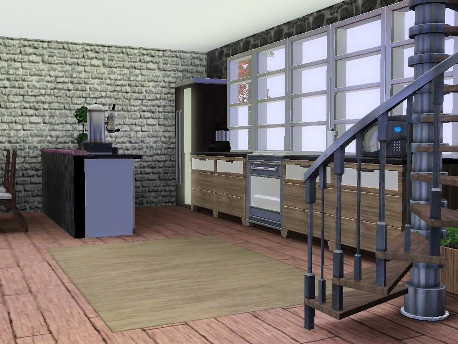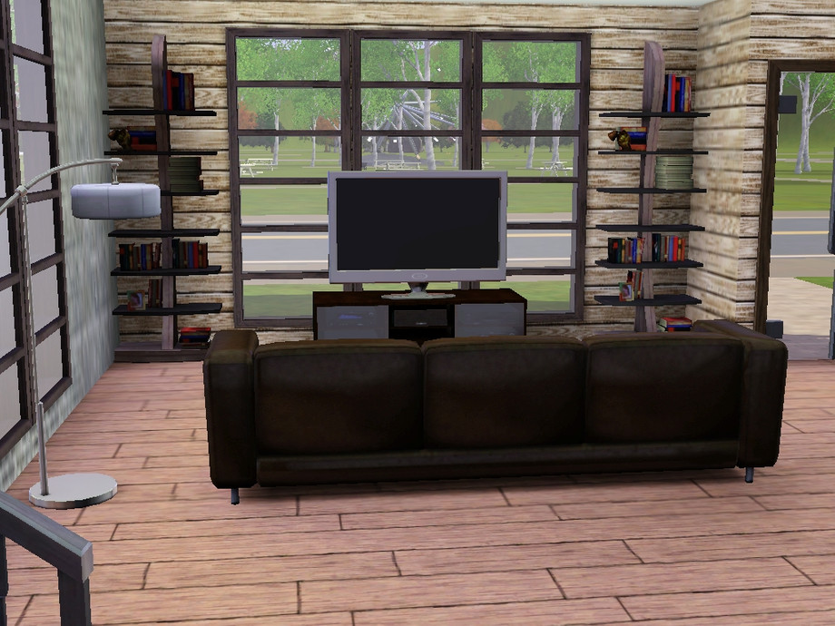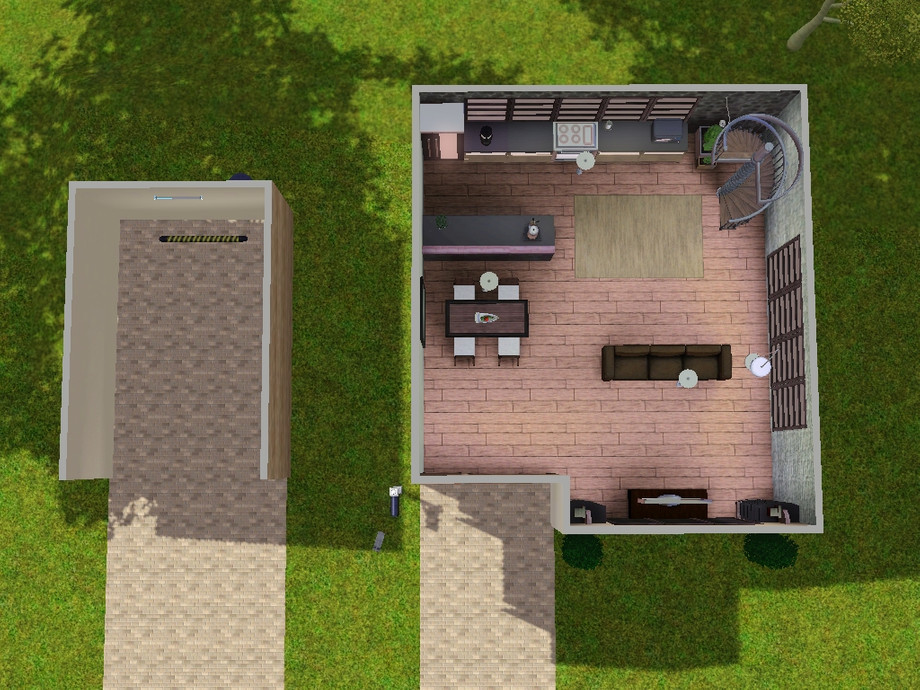 Modest bachelor pad for your sims. Open plan living downstairs (living area, dining area, kitchen), upstairs: bathroom, master bedroom with large balcony, guest room/study, reading area. Includes garage. Price furnished: $56,983, price unfurnished: $35,090.