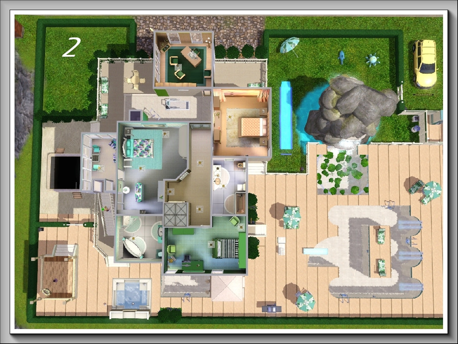 Rockpools is a modern, 3storey, 3bedroom/3bathroom summer residence with the main emphasis on enjoyment of water activities; it boasts a huge swimmingpool, a lily pool under the waterfall that flows down an enormous rock pile, a separate pool bar for adults and an outdoor hot tub. These are complemented by a covered dance pavilion with jukebox, a BBQ grill and plenty of poolside seating, both for relaxation and taking meals; there is also a one-stop 'bathroom' at the rear of the pool deck. A waterplay area is provided for younger Sims [or the young at heart] . . and for the more energetic there is a large trampoline in the side garden. All these areas are fenced with low hedging to keep roaming animals off the premises!