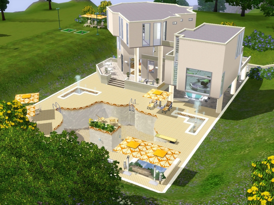 It should be noted that Satisfaction's 50x50 lot size will restrict where you can place it - in Sunset Valley you will need to create the lot - having first made room by removing a default, larger one - but in Island Paradise there are a number of lots this size. Also, although the house location itself is flat, the rest of the land rises on all sides. This was created naturally, no CFE has been used and no attempt was made to level where it wasn't necessary.