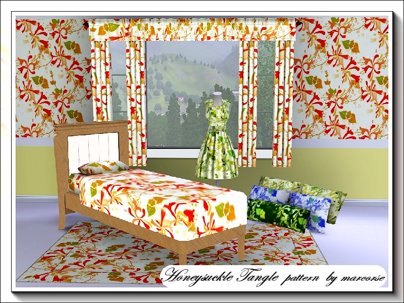 A tangled pattern of honeysuckle flowers, vines and leaves. 3 palettes recolour.