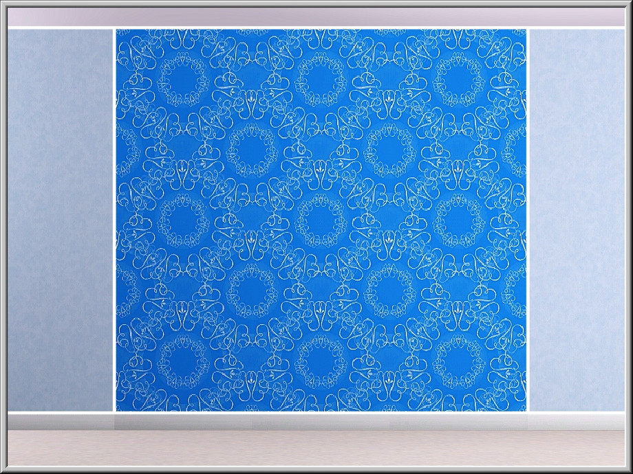 Abstract pattern: swirls and curleques resembling piped white icing on a blue cake.