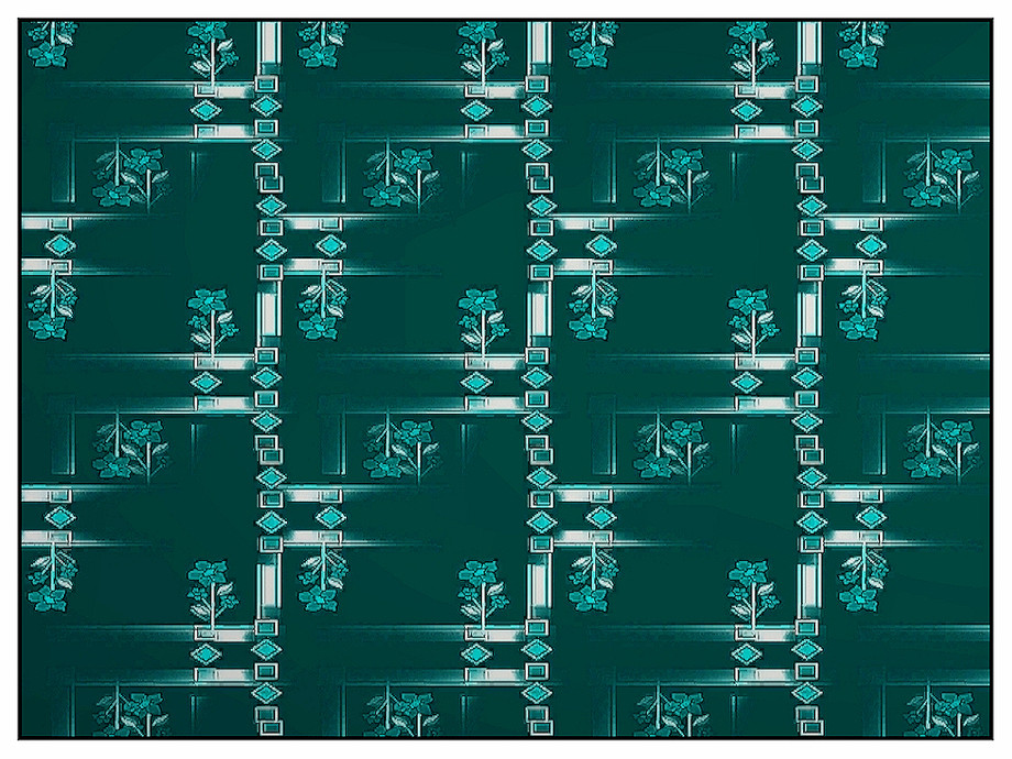 Abstract pattern : mirror image floral and geometric shapes in aqua on deep teal.