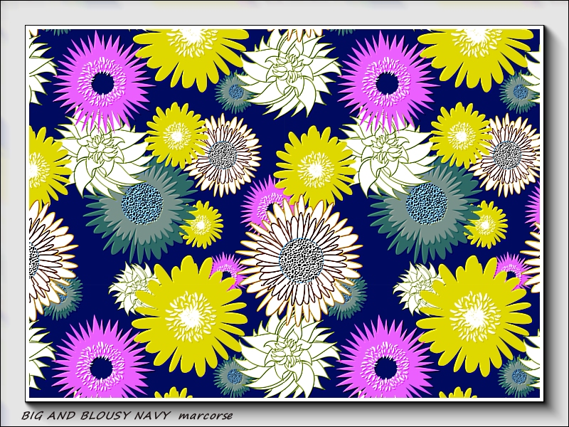 Big, splashy flowers in pink, yellow, white and grey on a navyblue background