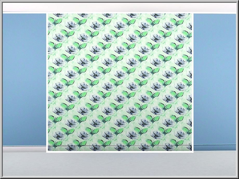 Fabric pattern: all=over design of blue field flowers and green leaves.