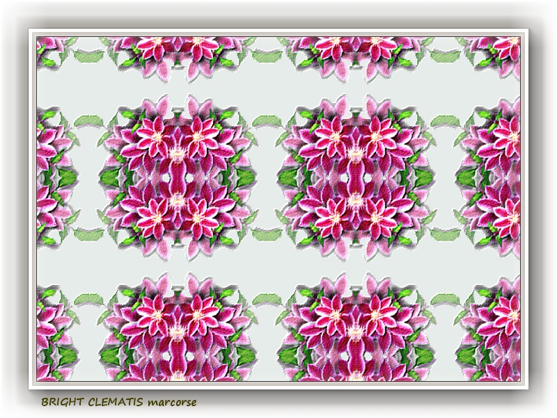 Eyecatching bunches of bright pinky-purple clematis blooms in a regular repeat pattern.