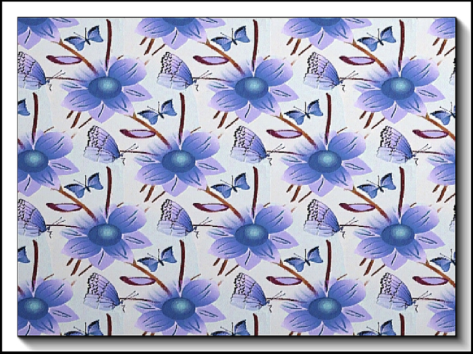 Fabric pattern- daisies and butterflies in blue, brown and white.