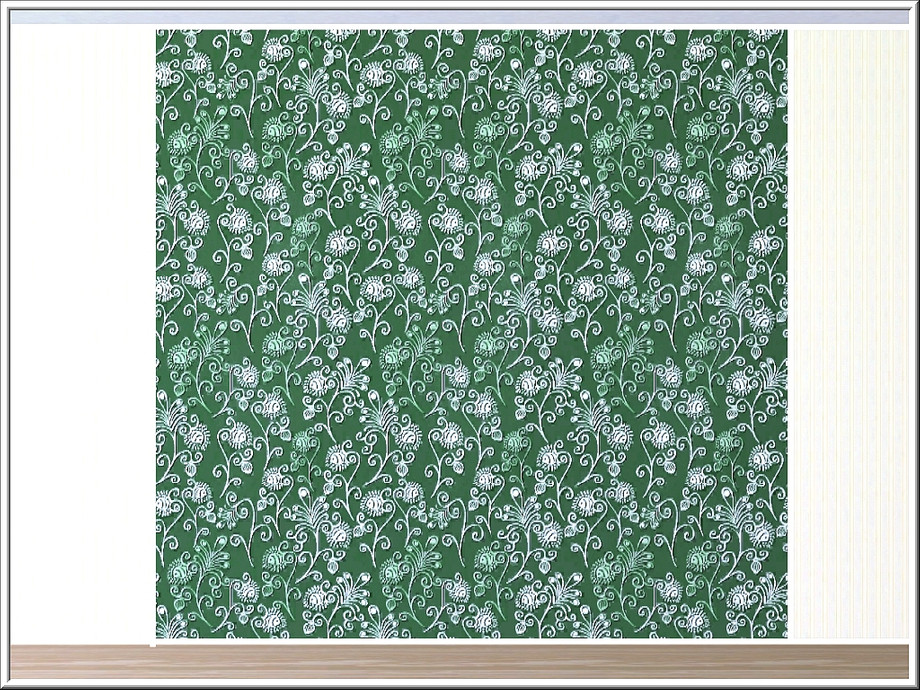 Fabric pattern: feathery leaf and flower shapes on green