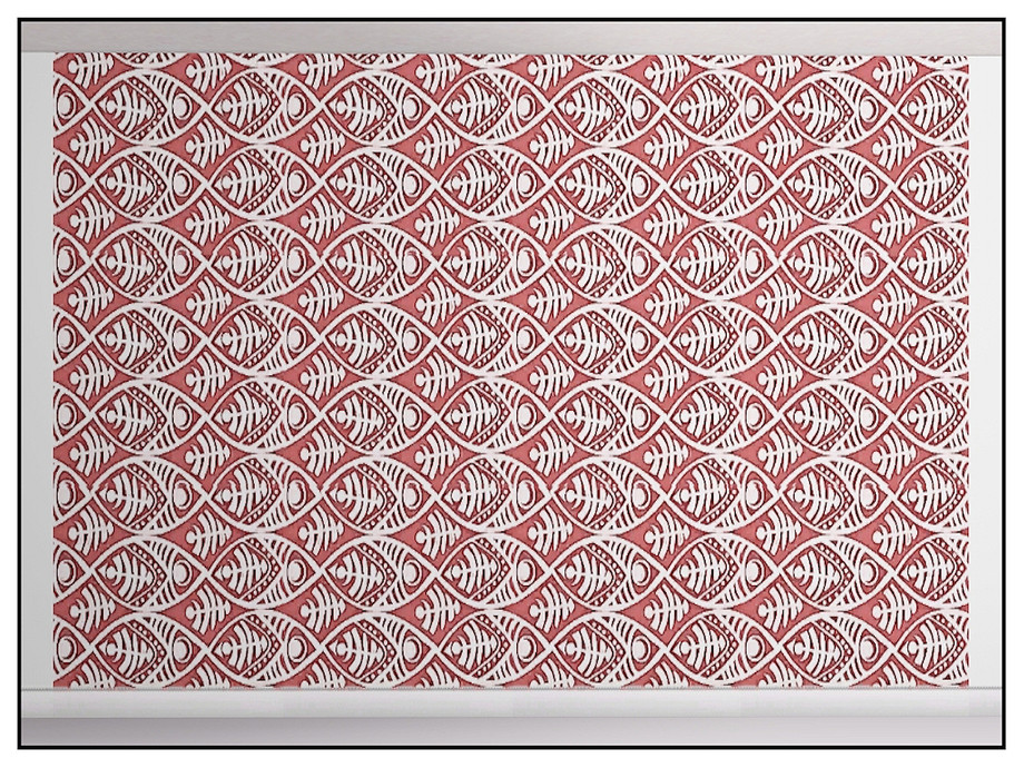 Fabric Pattern: stylised fossil fish in red/brown on white