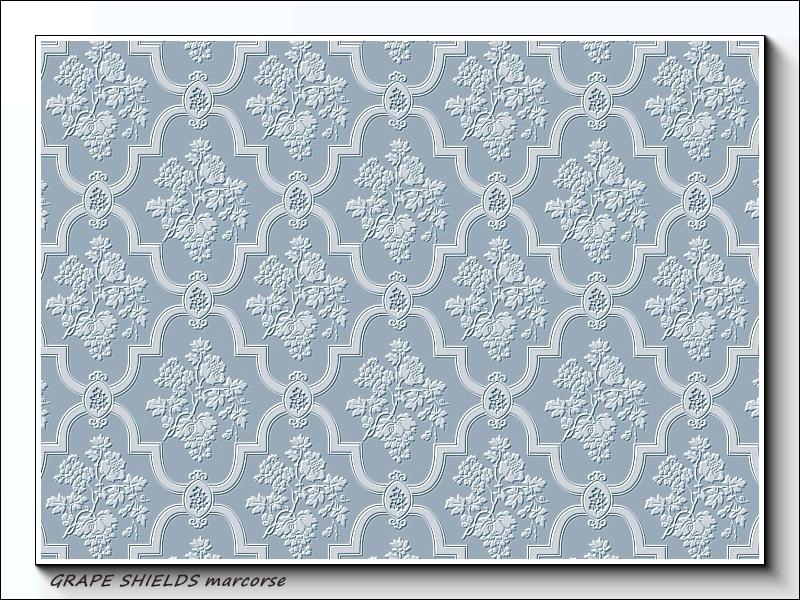 A classic wallpaper design featuring shields embossed with bunches of grapes; colours are pale blue and white.