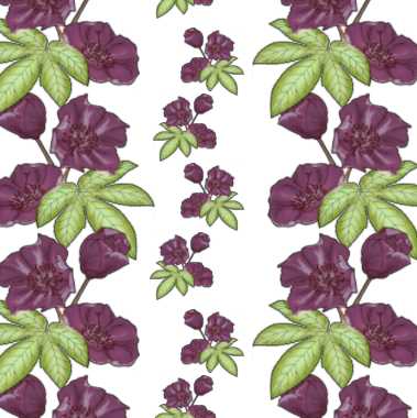Deep wine-coloured roses and green leaves in a vertical repeat pattern