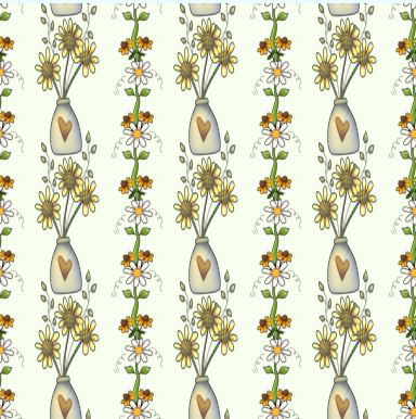 A happy daisy pattern based around a heart-decorated vase of the cheery flowers.