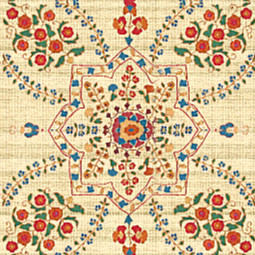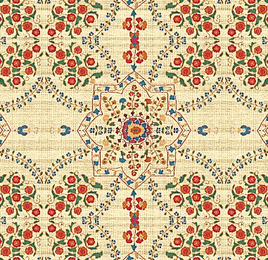 A pretty kaleidoscope pattern in shades of red, blue and natural, with a floral motif.