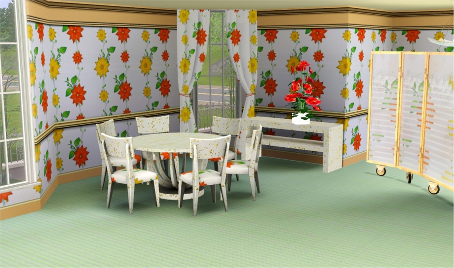 Credits: Table/chairs:LilyoftheValley. Sideboard:mensure. Window:dgandy. Curtain:magicdawn.Vase:jomsims.