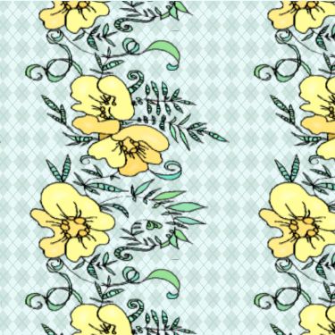 A simple vertical repeat pattern of mallow flowers and foliage, on a checkerboard backing.