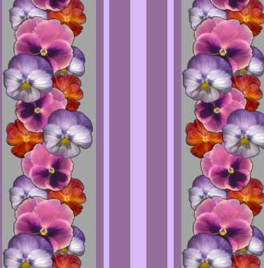 Cascades of my very favourite flowers dominate this vertical pattern - multiihued pansies in jewel shades with a contrasting stripe.