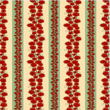 A simple, vertically striped repeat pattern of red flowers and tendrils on alternating bands of green and almost-yellow.