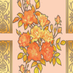 Bunches of autumn toned flowers, alternating with figured ribbon in an attractive vertical stripe pattern.