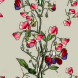 A climbing stalk of pink and purple sweet peas in a vertical repeat pattern.