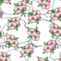 Pairs of pink briars in a scatter pattern on a background of the same image in an enlarged, monochrome version.