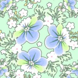 An allover repeat pattern of pansy wreaths in cool and refreshing shades of green and blue.