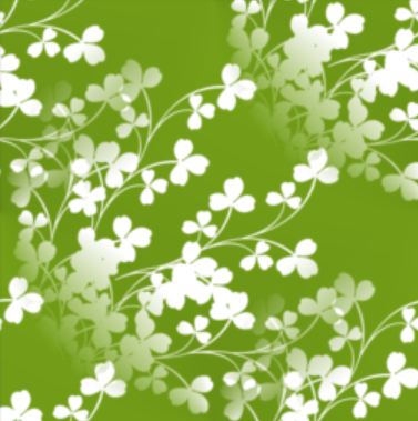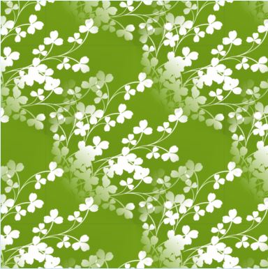 Sprays of stylised, white trefoil [tall clover], on a cool green background.