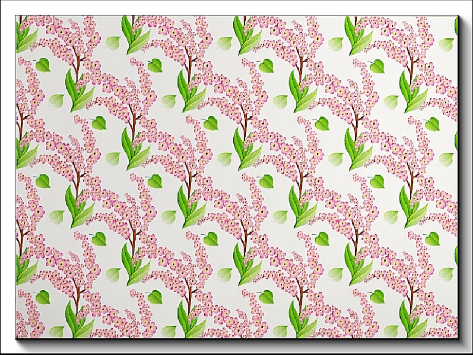 Fabric pattern - sprays of mayflower shrub in pale pink and green.