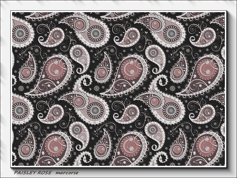 Another traditional paisley design with the motifs coloured in a pretty old rose pink with white accents, on a black background.