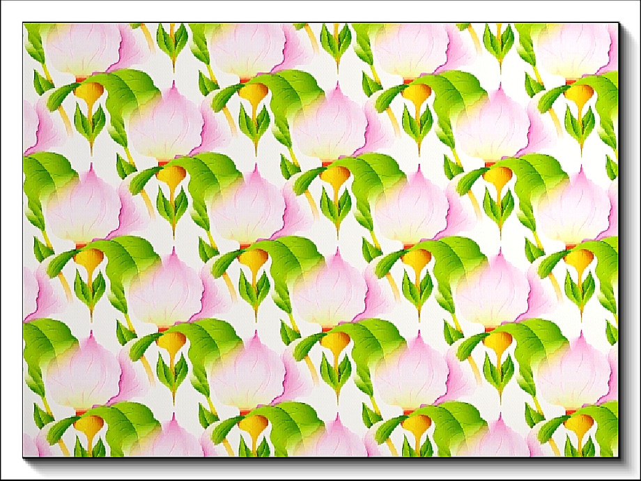 Fabric pattern pale pink flag iris and green foliage.