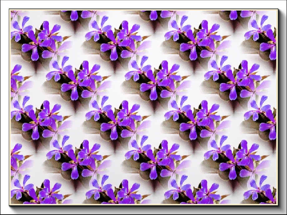 Fabric pattern- single, bright blue/purple geraniums. on white.