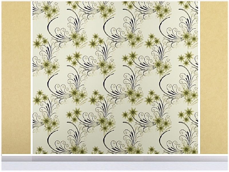 Fabric pattern: trios of small green flowers and style elements on soft yellow