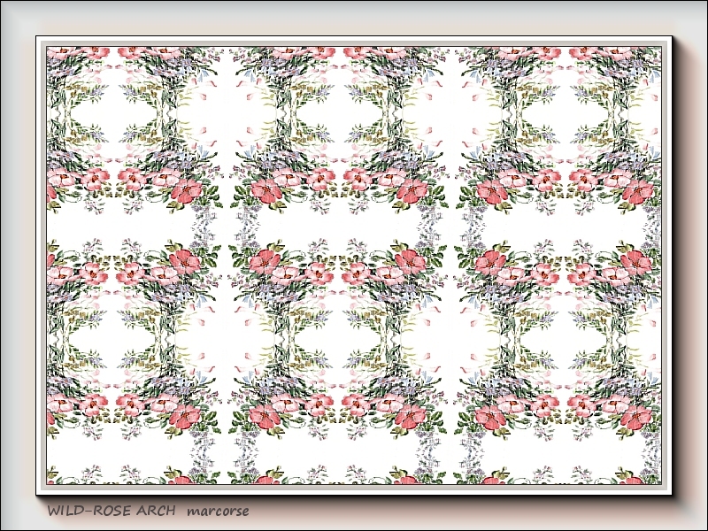 Wild roses in profusion in an arch-like repeat pattern.