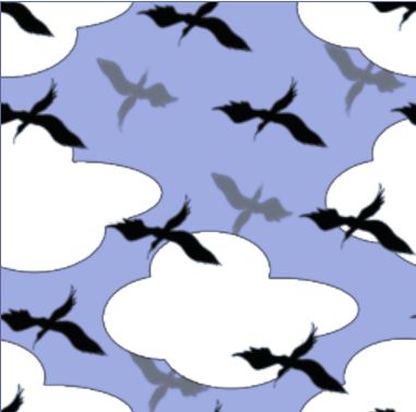 A novelty pattern of birds soaring in a cloud dotted blue sky