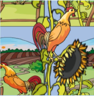 A very bold and bright novely design, this pattern features a crowing cock against a rural scene and a huge sunflower.