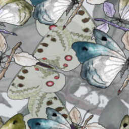 A novelty pattern created with a tiled blue butterfly and a white moth. Recolourable: 4