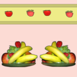 Suitable for kitchen, breakfast nook, morning room decoration, this pattern features a fruit bowl, strawberries and a toning, horizontal stripe