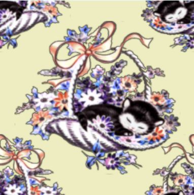 A sweet little novelty design featuring a little black and white kitten, sound asleep in a ribbon-tied, basket of flowers.