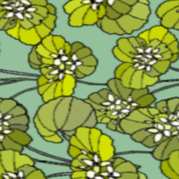 An allover, repeat design featuring clumps of white flowers and frilly, multicoloured green leaves on a deeper green ground.