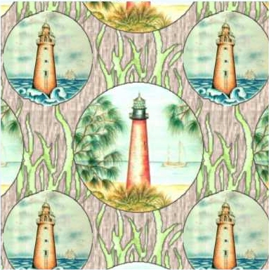A pattern with a nautical theme of lighthouses and sea grass.