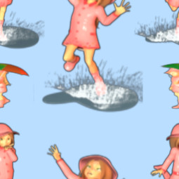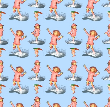 A fun pattern for a small girl's room, features a young lady in her wellingtons and raingear, jumping in - and out of- puddles.