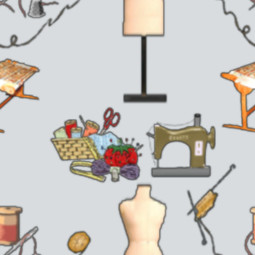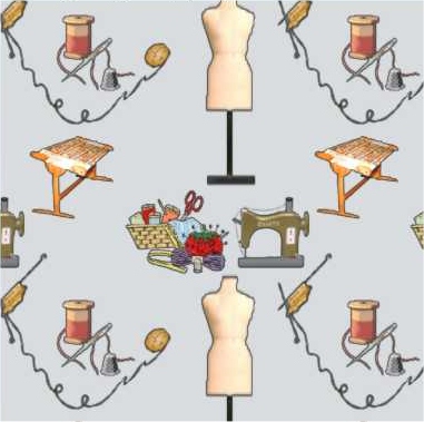 A novelty pattern for a sewing room or laundry - contains all the usual suspects for making, repairing and crafting.