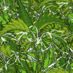 Lush and green, an allover pattern of tropical foliage.