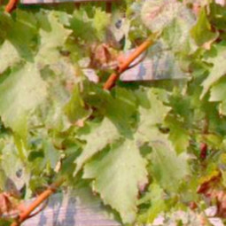 This pattern originated in a photograph of a vineyard, showing grape vines, leaves and supports.