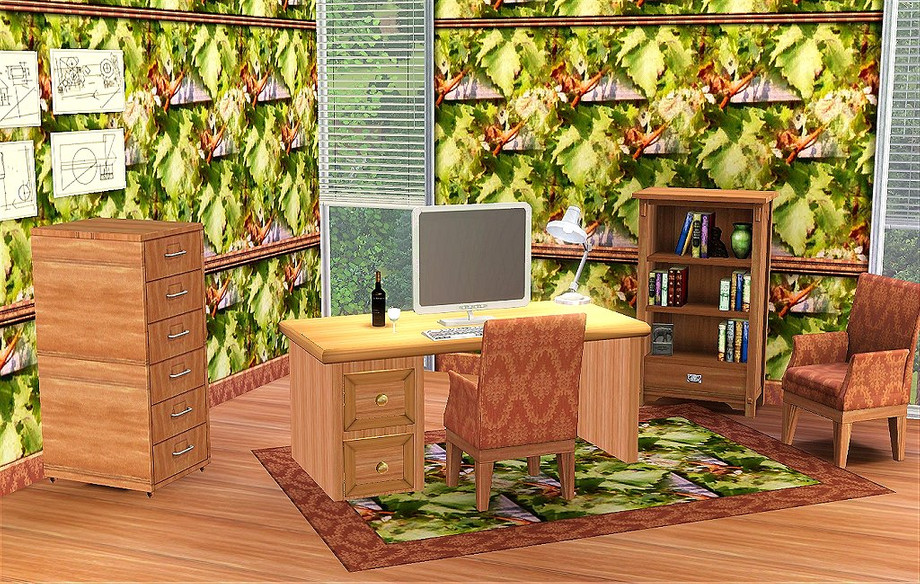 Made for TSR in Create a Pattern. Do not re-upload, outside of TSR. Sorry, only 1 recolour. Credit for objects in style shot: Desk:riccimumbers. Filing/blind:TheNinthWave. Computer:babybluebug. Wine decor: mensure.