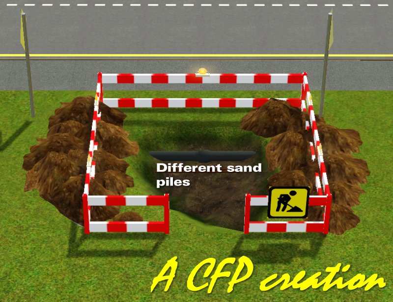 Medium sand dump found under Decor / Misc. Decor, costs 0. Rotate the sand to created endless combinations. The sand can be placed into the fence to make it look real, use the cheat moveobjects on.