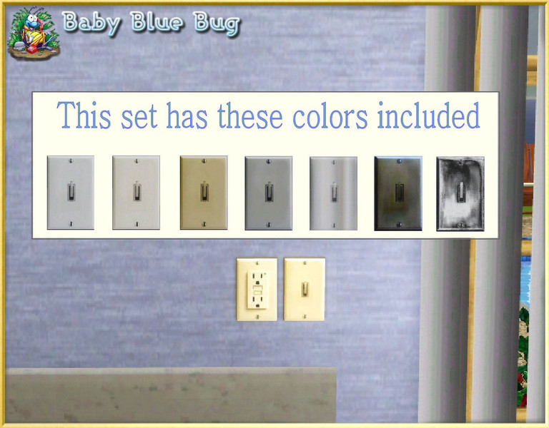 bbb Wall Light Switches created by babybluebug. This wall switch includes the colors shown on the picture. With "moveobjects on" cheat you can set the upper wall outlet that I created by the light switches side for a realistic look. Light Switch can be found in the buy mode, electronics, miscellaneous.