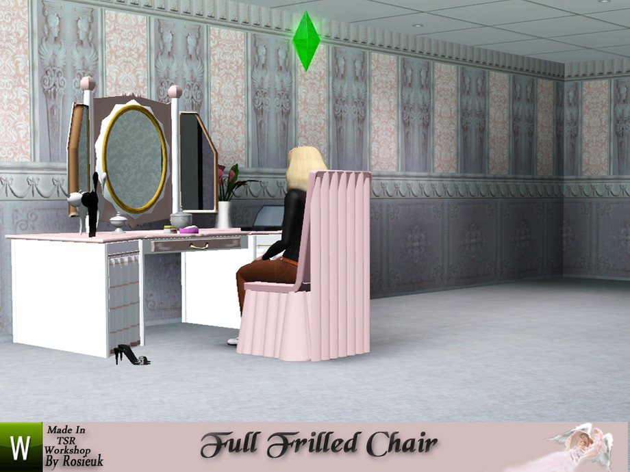 These are two lovely chairs which are made for your sims that wish that special day just to be so perfect the wdding chair has a full frill on the seat and also draped from the top of the chair back which is finished with a full bow, the other chair is for your sims to use at the dressing table for tha all important day both the chairs are the same but this has no bow to it, this is fully recolorable,