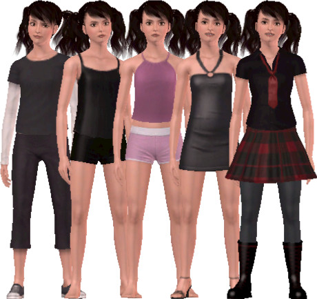 Cally's hair is from Club Crimsyn, her lipgloss from lemonleaf, the dress from LorandiaSims3, the boots from Parsimonius (I think). I think she's really cute and adorable. :)