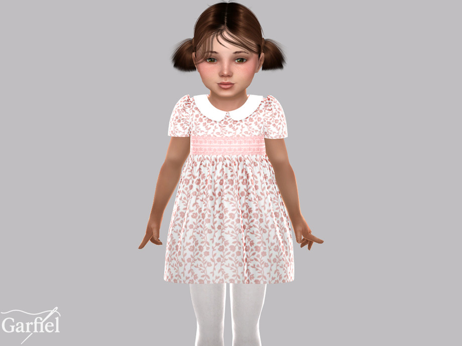 A gentle vintage inspired toddler dress featuring a rounded white collar, short puffed sleeves, and a delicately patterned floral fabric. The fitted upper panel transitions into a lightly gathered skirt, giving the dress a sweet, airy silhouette. Perfect for everyday charm, family scenes, or any outfit that needs a soft, timeless look