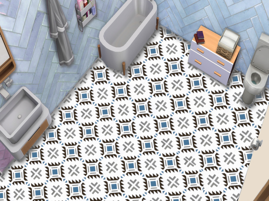 3 floor tiles both consisting of aztec-esque patterns in 4 colours each